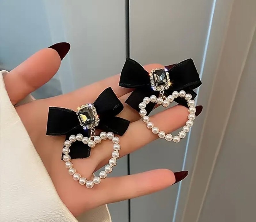 Siyah fiyonk ve inci detaylı küpeler, klasik zarafet ile gotik tarzı birleştirir, düğünler için uygundur.