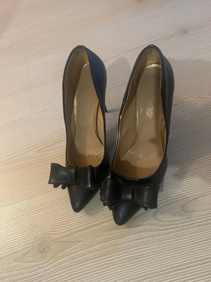 Siyah fiyonklu, lastik malzemeden modern klasik stilettolar, ofis için uygun.