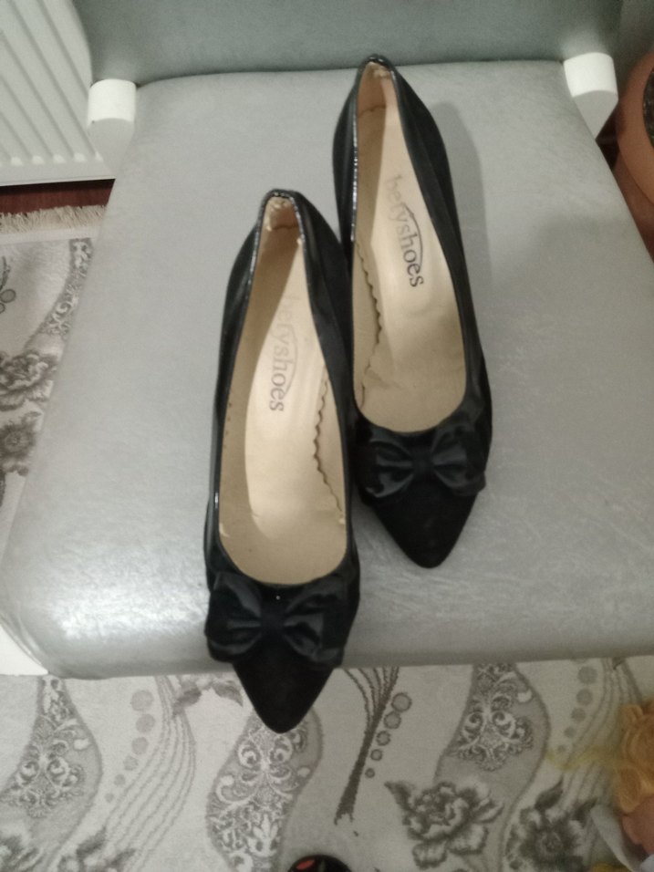 Siyah fiyonklu, kauçuk malzemeden yapılmış stiletto topuklu ayakkabılar. Klasik goth tarzında, düğün gibi özel günlere uygun şık ve koyu renkli model.