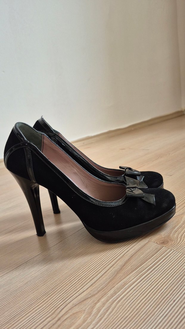 Siyah renkli, fiyonk detaylı yüksek topuklu ayakkabı. Düz yüzeyli ve şık tasarımlı. Kauçuk malzeme kullanılmış. 38 numara