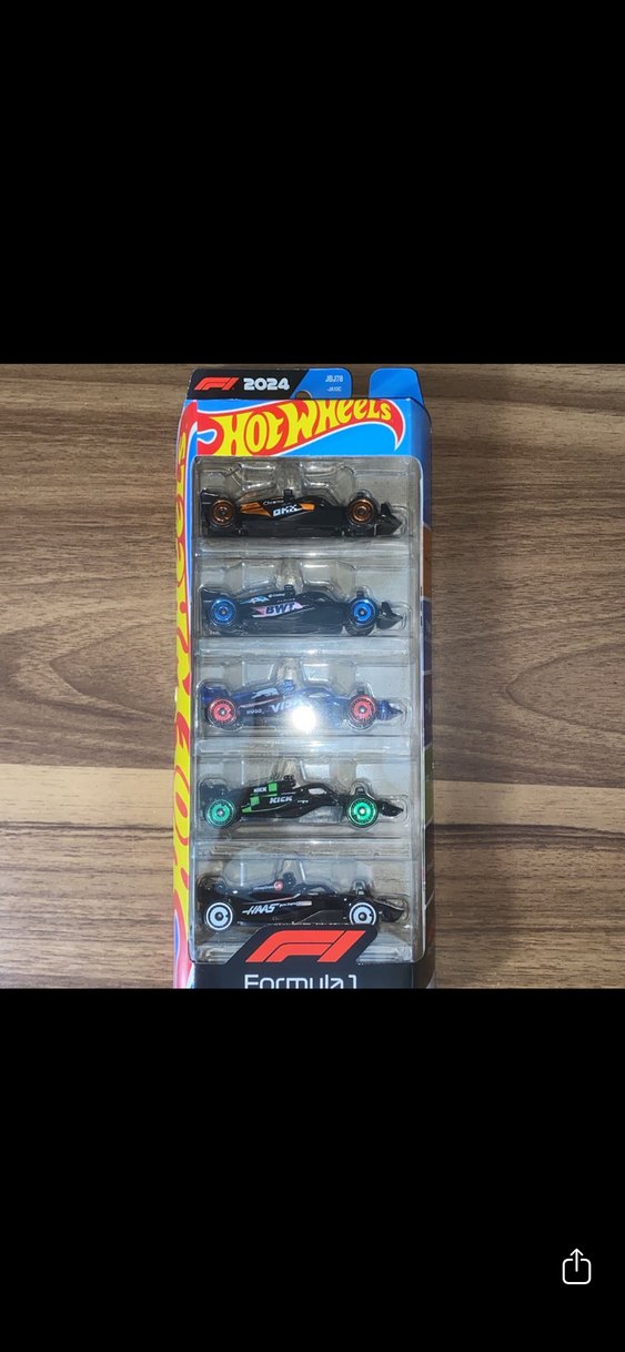 Bu Hot Wheels seti, farklı renkli jantlara sahip beş siyah Formula 1 oyuncak arabadan oluşur. Ambalajda 2024 yılı işaretlidir. ️