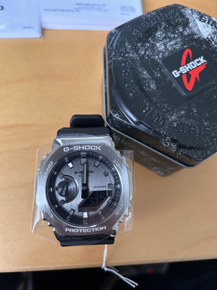 Siyah G-Shock erkek kol saati, rock punk tarzında ve 'PROTECTION' yazılı çerçeveye sahip. Sokak stiline uygun koyu ve sağlam görünüm sunar. ⌚