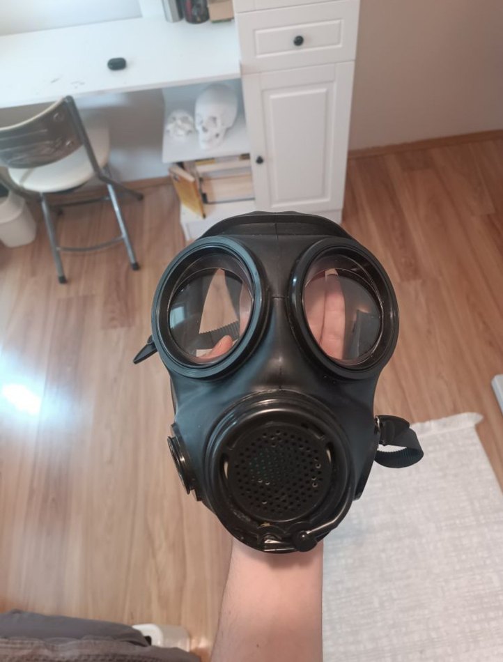 Tam yüz koruma sağlayan siyah gaz maskesi, ayarlanabilir bantlarla güvenli kullanım sunar. Büyük yuvarlak camları ve merkezi filtresi bulunur. ️