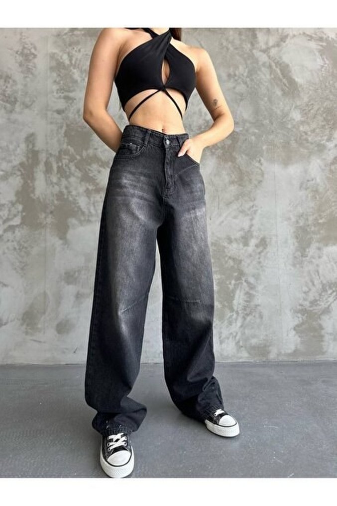 Siyah, geniş kesim, midi boy normal uzunlukta denim pantolon. Desensiz, gri tonlarında, günlük kullanım için rahat ve şık bir seçim. baggy pantalonn