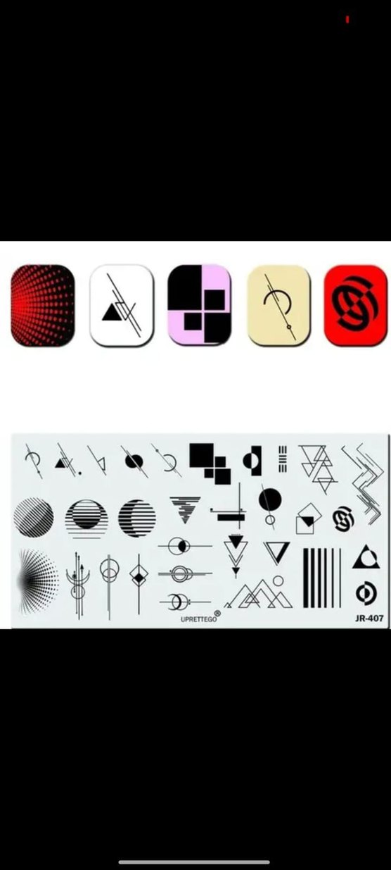Çeşitli soyut desenlerle siyah geometrik tırnak süslemeleri, JR-407 etiketli, yaratıcı tırnak tasarımları için uygundur.