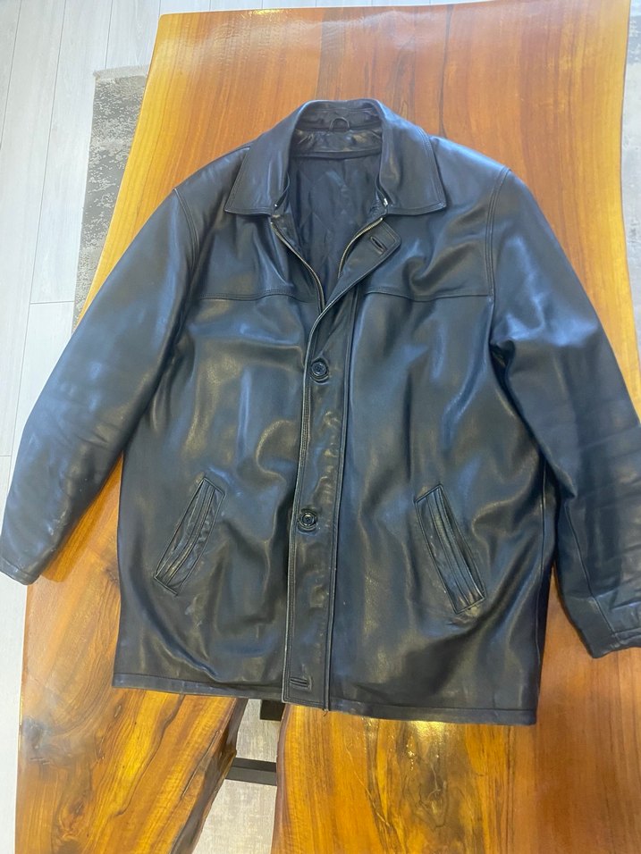 Gerçek siyah deri erkek ceket. Düğmeli ve fermuarlıdır boy 85 cm iki koltuk altı arası 70 cm kol 64 cm 56-58 bedene olur ölçüleri dikkate alınız içeride iki fermuarlı cebi vardır. Cekette yırtık sökük vs yoktur bir düğmesi eksik ve fermuarın bir kısmı bozuk boyaya ihtiyacı var ağır kalın bir cekettir kusurlarından dolayı fiyatı uygun tutuyorum