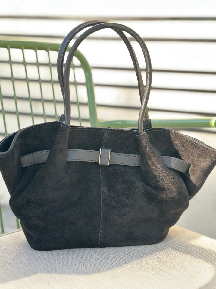 Siyah gerçek süet malzemeden yapılmış, kemer detaylı ve çift saplı kadın çantasıdır. Günlük kullanıma uygun, çağdaş Paris tarzını yansıtır.