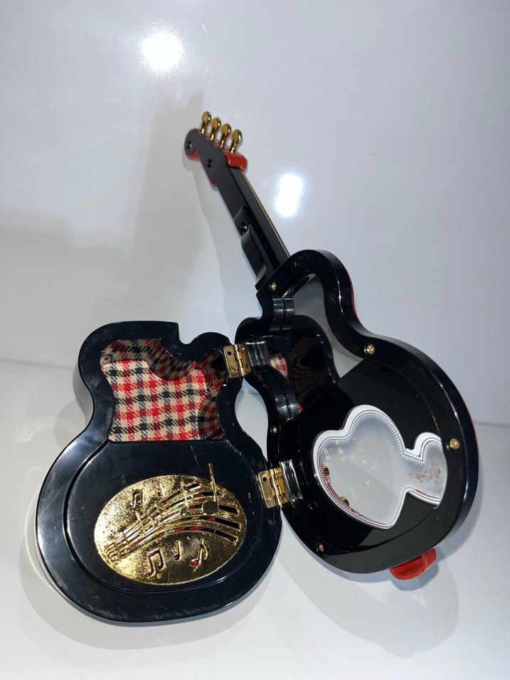 Parlak siyah gitar şeklinde müzik kutusu, iç kısmında altın renkli müzik notları, kırmızı beyaz kareli kumaş ve ayna bulunur.