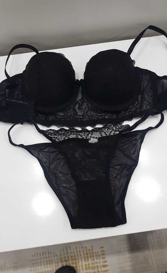 Siyah gotik sütyen takımı, dantel detayları ve midi uzunluğuyla şık ve koyu bir görünüm sunar. Takım, dantelli sütyen ve şeffaf külot içerir.