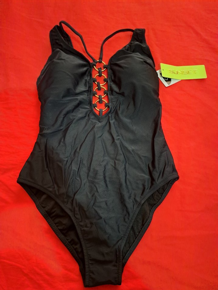 Siyah, göğüs kısmı bağcıklı, ince askılı ve kemerli, vücuda oturan kadın mayosu. ️