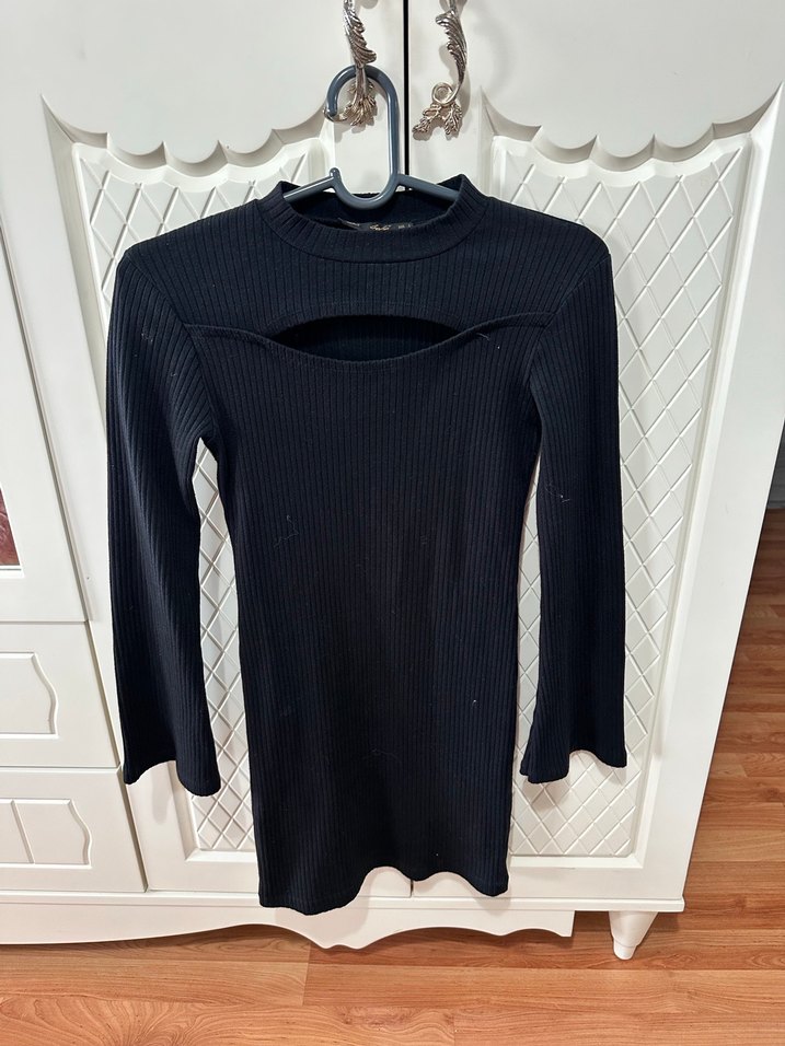Siyah, uzun kollu ve yüksek yakalı bu örgü midi elbise, kesik detaylarıyla minimalist ve şık bir sokak tarzı sunar.