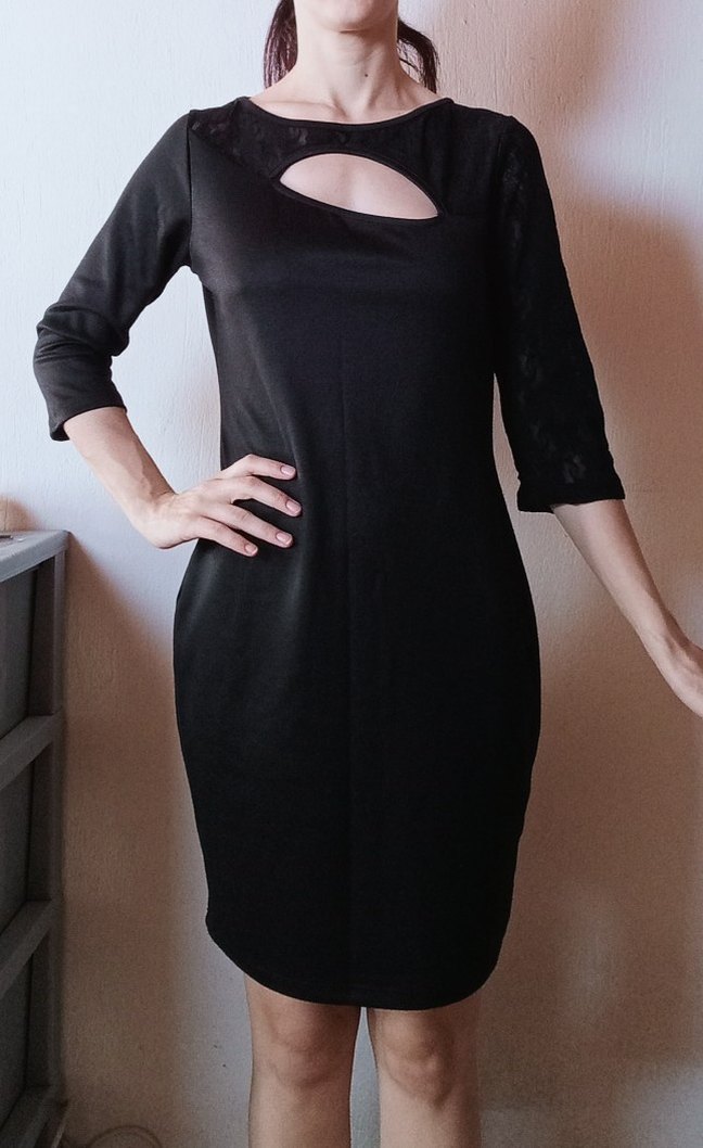 siyah uzun kollu göğüs dekolteli elbise bir kolu ve ön göğüs üstü dantel, önyaka etek uzunluğu 81 cm sırt etek uzunluğu 86 cm göğüs altı uzunluğu 42 cm hafif bir esnekliği var small ve medium uyumlu.
