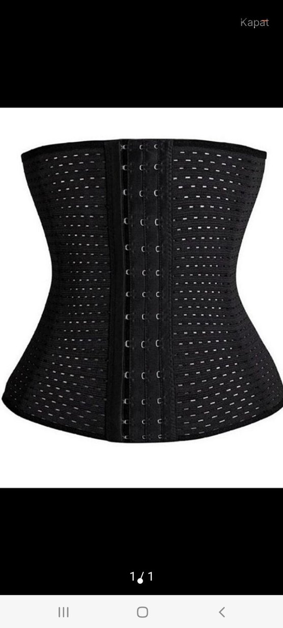 Siyah göğüs korsesi, sıkı oturan kesim ve orta boy uzunlukta. Rahatlık için nefes alabilen delikli kumaşa sahiptir. balensiz üründür