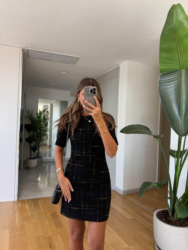 Siyah Gold Efektli Kısa Kollu Tüvit Elbise