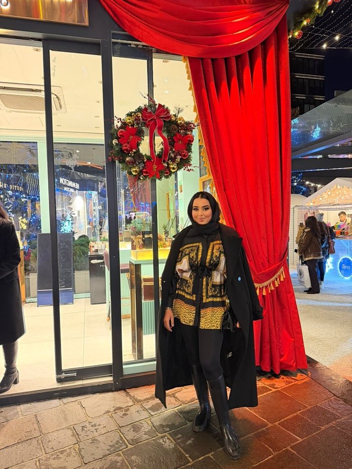 Drapeli tasarımı, yüksek yakası ve uzun kollu etnik desenli siyah uzun kaban, ipeksi kumaştan yapılmıştır. Parti için uygundur.