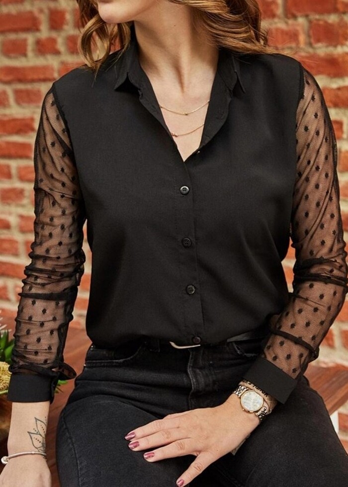 Hiç giyilmedi etiketli şık siyah gömlek kolları tül detay S beden #siyah #kadıngömlek