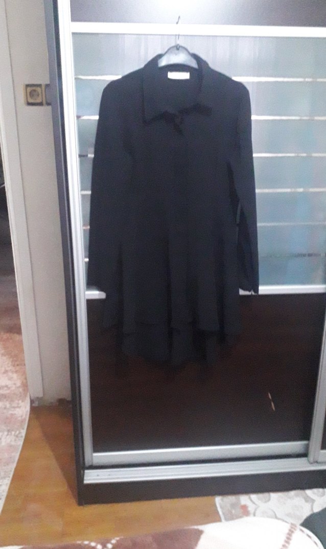 arkadan kuğu gibi uzanıyor düğmeler gizli düğme gözükmüyor kolları fermuarlı simsiyahtir boy 90 iki göğüs arası 45 aşırı şık siyah pantolon beyaz sporla kombini harika