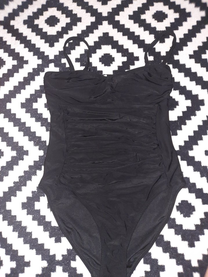 İnce askılı, siyah ve vücuda oturan bu mayo, gotik tarzda plajda şık bir görünüm sunar.