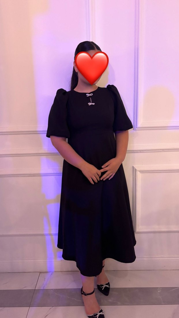 Siyah, kısa kollu ve halter yakalı, ipeksi dokulu midi elbise, rahat ve şık bir görünüm sunar. Gotik tarzıyla romantik akşamlar için uygundur. Desensiz ve vücuda oturan kesimlidir. 1.60 boyum 65-75 kiloya olur