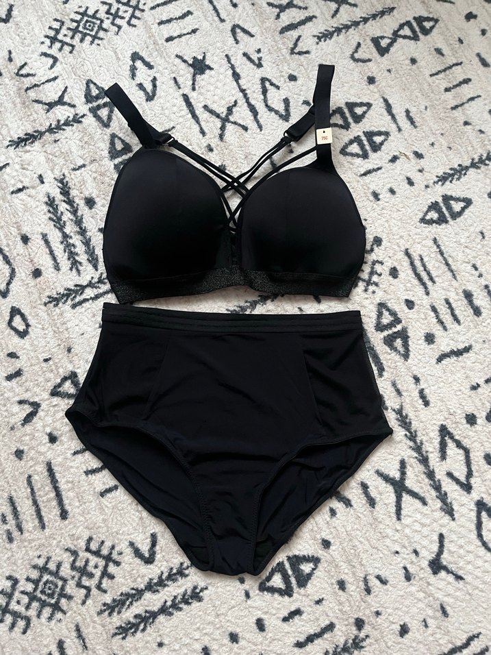 Siyah, goth tarzı sütyen ve yüksek bel mini külot seti, ayarlanabilir askılarla rahat kullanım sağlar. Sm beden sıfır