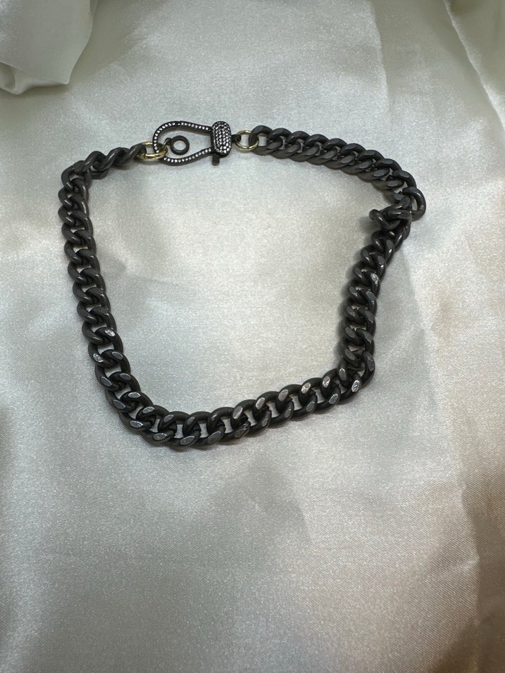 Siyah zincirden oluşan erkek kolye, gotik tarzda toka detayı ile dikkat çekiyor. Koyu renk ve güçlü görünüm sunar.