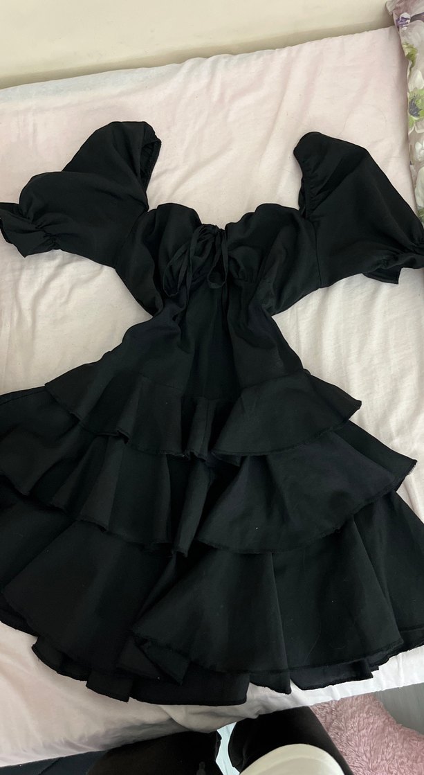 Siyah renkli, tek parça, midi boy, göğüs kısmı büzgülü, volanlı, kayık yaka ve askılı elbise