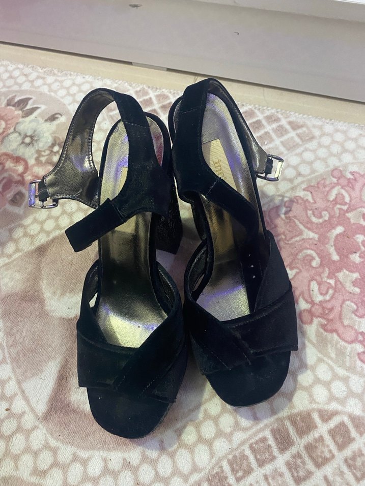 Siyah, tokalı bantlara sahip platform topuklu, kauçuk malzemeden goth tarzı kadın ayakkabısı. Cesur görünüm için romantik akşamlara uygun.