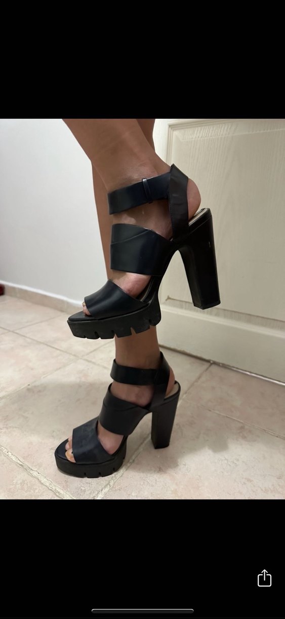 Siyah renkte, tokalı kayışlara ve desenli kauçuk tabana sahip cesur goth tarzında platformlu kadın topuklu ayakkabı.