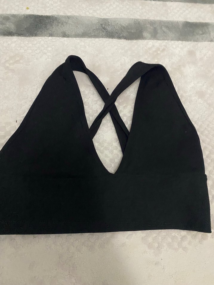 Siyah goth tarzı spor sütyen, çapraz askılı ve normal uzunlukta. Rahat ve sade tasarım sunar. M l beden