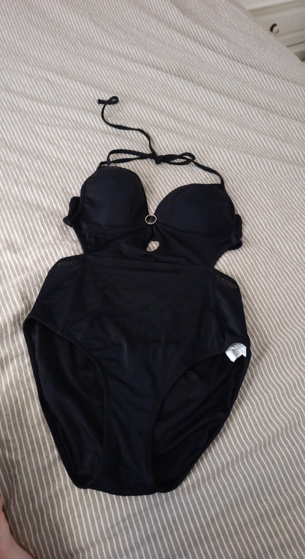 Siyah renkte, goth tarzı tokalı ve askılı, vücuda oturan midi uzunlukta kadın mayo. Cesur plaj stiline uygun.