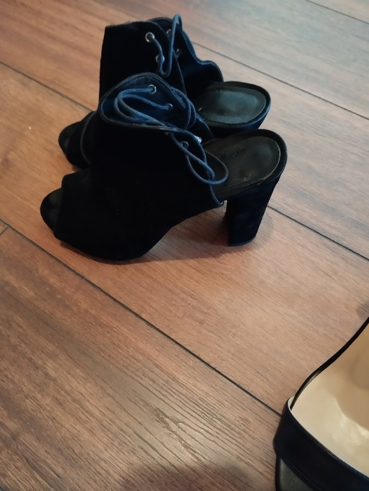 Siyah, tokalı bantlara sahip blok topuklu kadın sandaletleri. Gotik tarzda, romantik buluşmalar için uygun, kauçuk malzemeden üretilmiş.