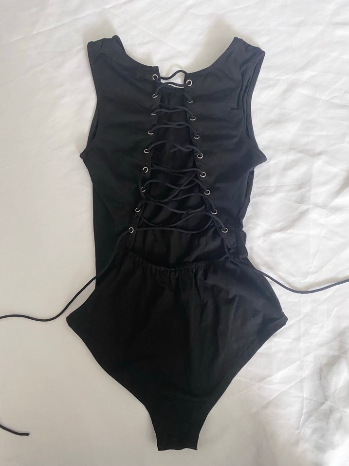 Siyah, göğüs kısmı ip bağcık detaylı. Bel kısmı lastikli. Alt kısmı çıtçıt detaylı, body şeklinde bir bluz. Hiçbir sorunu yok. Göğüs kısmı tamamen ip, altında astarı mevcut değil, dekolte. Kesinlikle mayo değil, uygulama bu kategoriyi zorunlu kılıyor, MAYO DEĞİL. #y2k #goth #gothic