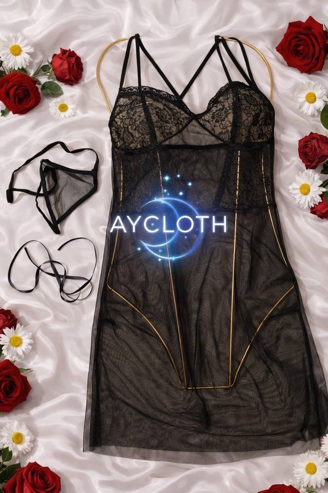 Askılı kollu, siyah gotik midi gecelik. Dantel ve tül detaylarla şık ve karanlık bir görünüm sunar. Uyumu aksesuarlar dahildir.