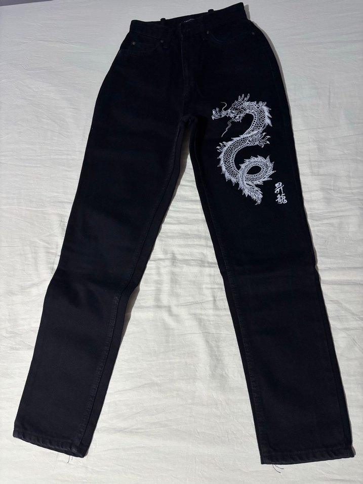 siyah denim kot pantolon, beyaz ejderha baskısıyla gotik tarzda, günlük kullanım için uygun.