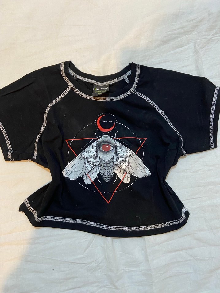 Siyah pamuklu kadın tişörtü, bol kesim ve kısa kollu, gotik baskılı tasarıma ve yuvarlak yakaya sahiptir. Dış mekan kullanımı için uygundur, rock punk havası verir.