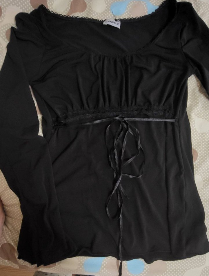 Siyah, kemerli ve V yakalı bu bluz, düz ve sentetik kumaştan yapılmıştır. Gotik tarzda, normal boyda ve vücuda oturur.