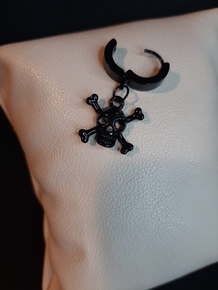 Siyah gotik tarzda çelik küpe, halka şeklinde ve kafatası ile çapraz kemik figürlü karanlık bir tasarıma sahiptir.