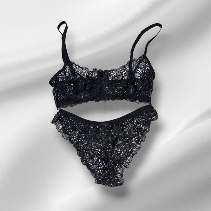 Siyah gotik dantel sütyen ve külot takımı, ayarlanabilir askılar ve midi uzunlukta alt parça ile şık bir görünüm sunar. bedenler:75-85