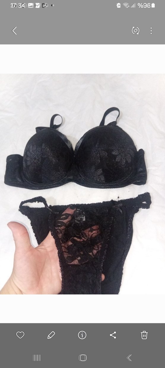 Siyah gotik tarzda, dantel detaylı sütyen ve tanga takımı, normal boyda ve desensiz.