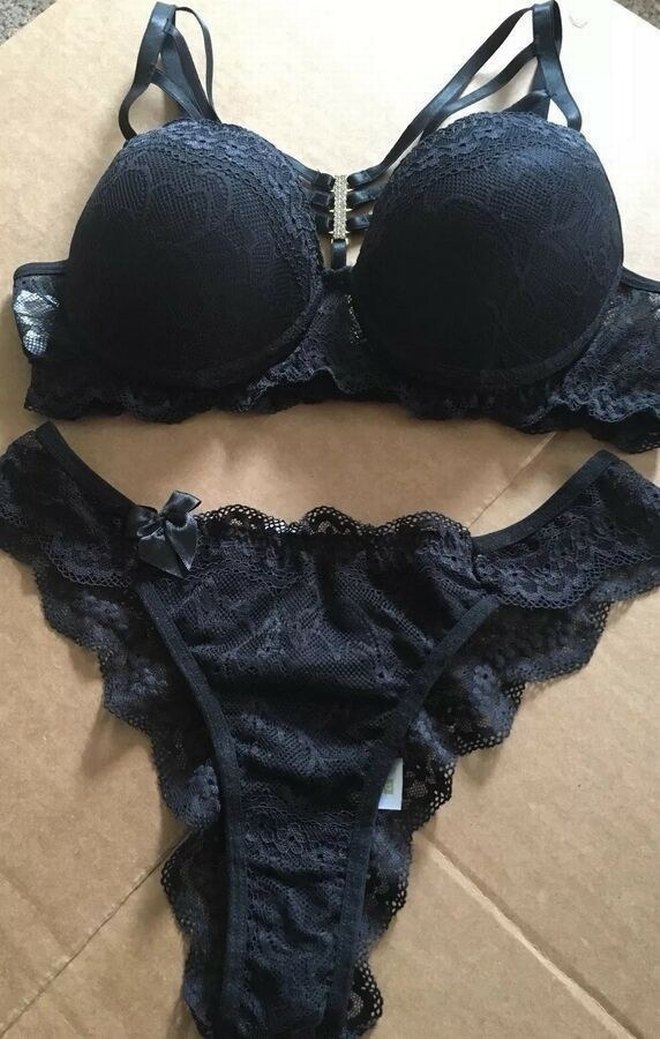 Siyah gotik tarzda dantelli sütyen ve normal midi uzunlukta külot takımı. Sütyen dolgulu ve dekoratif askılı, külot küçük fiyonk detaylı.