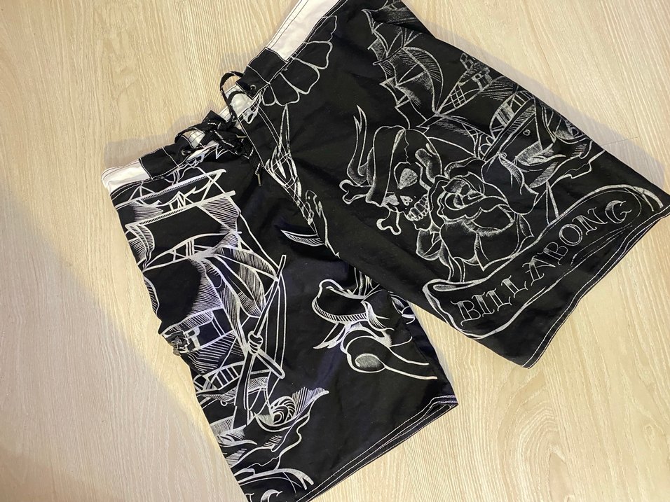 Siyah, gotik desenli, bol kesim ve midi boyda erkek yüzücü şortu, dış mekan kullanımı için uygun.
