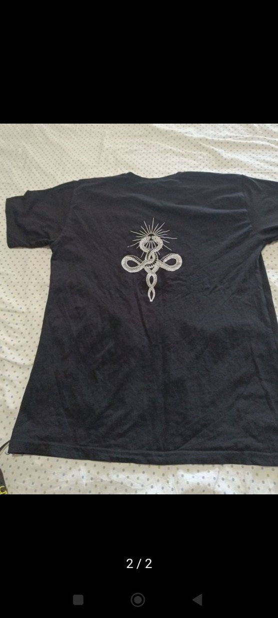 kısa kollu, yuvarlak yakalı tişört Siyah, ipeksi kumaş ve gotik baskı detaylı, bol kesim ve midi boyda.