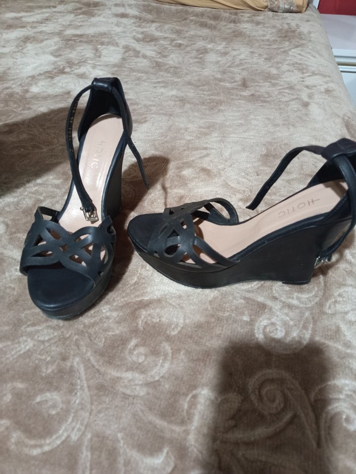 Siyah, dolgu topuklu, tokalı kayışlı, minimal ve gotik tarzda kadın ayakkabısı. Romantik akşamlar için uygundur.