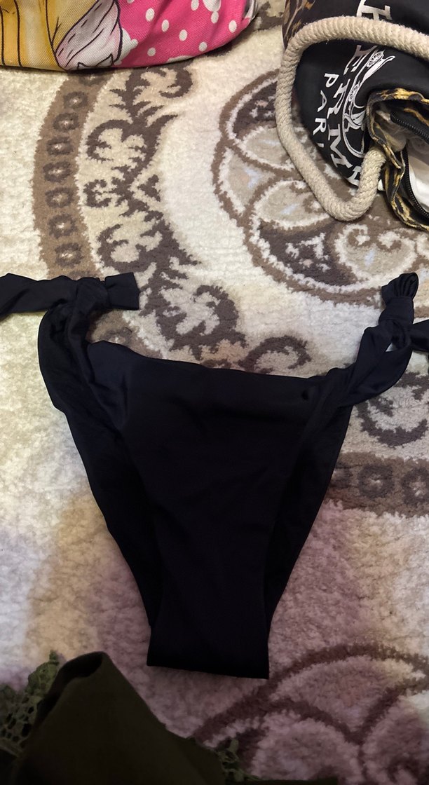 Siyah, drapeli ve askılı tasarıma sahip dar kesim bikini altı, cesur gotik tarzını yansıtır.
