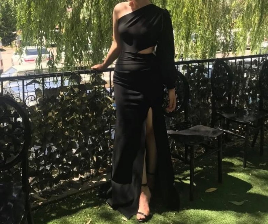 Bu siyah uzun abiye elbise, 1 kere 2 saatliğine giydim o da fotoğraf içindi straplez yaka kol detayına sahip drapeli tasarımla dikkat çeker. Gotik tarzda, romantik akşamlar için uygundur.