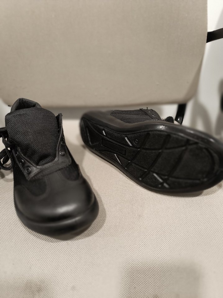 Kemer detaylı, siyah gotik erkek botları. Düz ve koyu renkli şık tasarım.