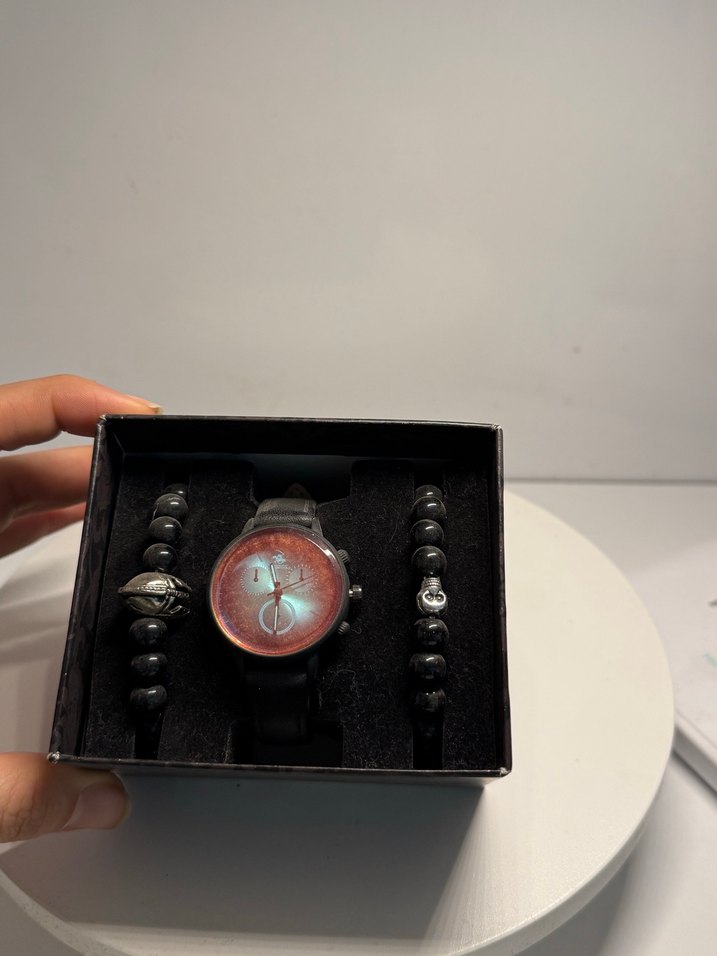 Siyah gotik erkek kol saati ve uyumlu boncuklu bilekliklerden oluşan set. Koyu ve cesur tasarım öğeleriyle gotik tarz sevenlere uygun. ⌚