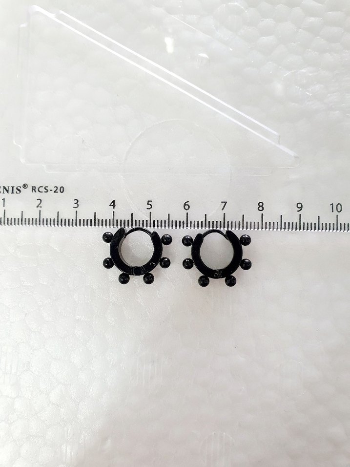 Siyah gotik tarzda, kenarlarında küçük renkli boncuk detayları bulunan yuvarlak erkek küpeler. Rock punk havası için uygun.