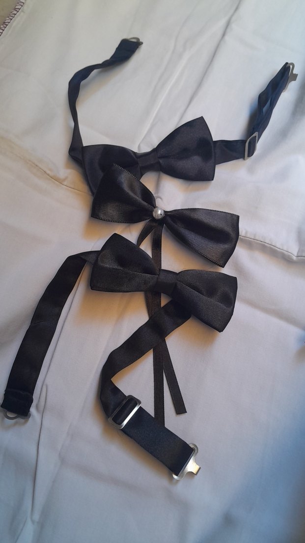 Ayar ayarlı üç siyah papyon seti. Ortasında inci detayı bulunan papyon gotik tarzda, desen yok. Trend belirleyiciler için şık bir aksesuar.