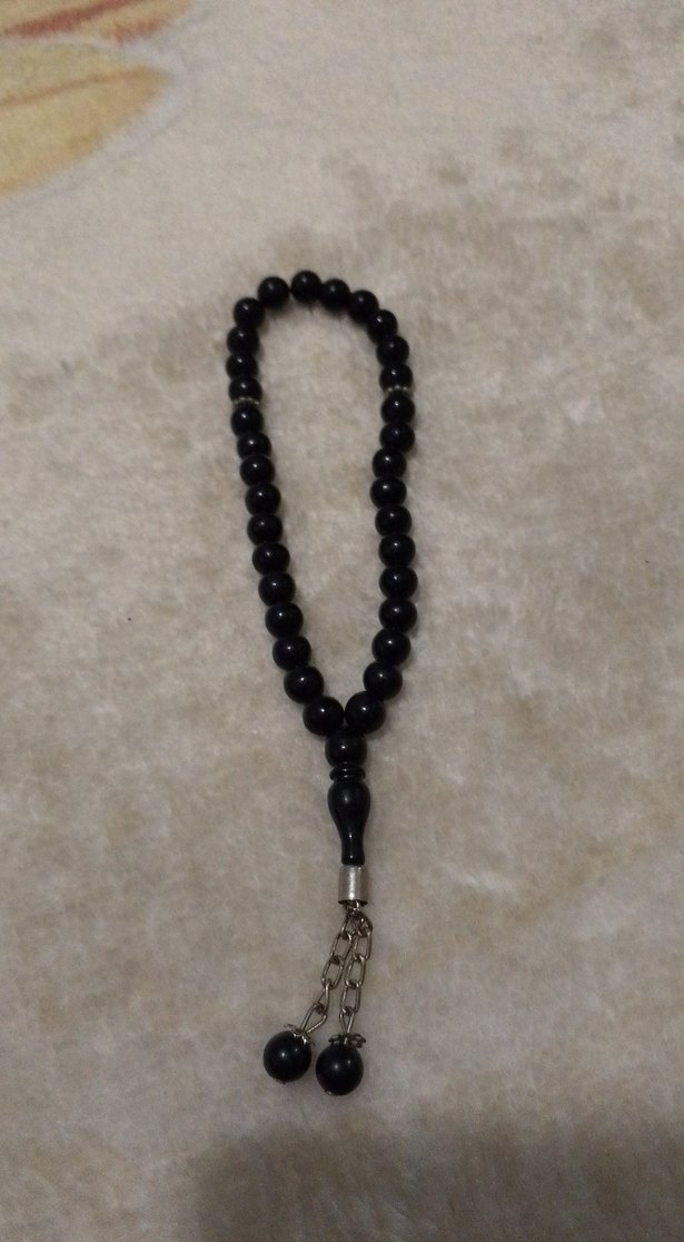 Gotik tarzda siyah, parlak boncuklardan oluşan erkek tesbih, metal zincir püsküllerle tamamlanmıştır.